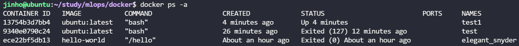옵션으로 -a를 넣고 실행하면 실행되었던 컨테이너까지 출력이 됩니다.