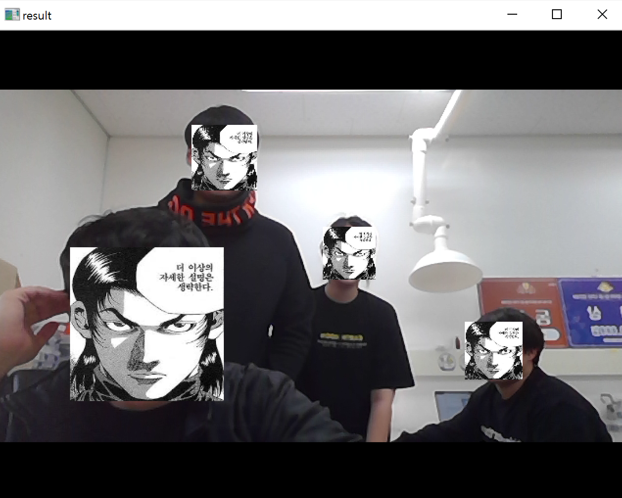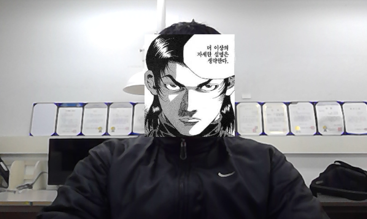 위의 코드를 실행하면 아래와 같이 실시간으로 탐지된 얼굴이 강건마로 잘 바뀌고 있는 것을 확인할 수 있다.