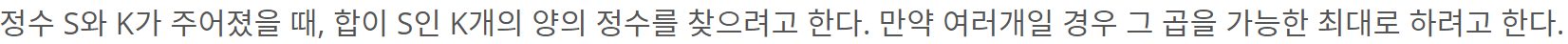 내 생각엔 곱이 최대가 되는 정수의 조합은 [S//K] * K에 각 요소 S%k개에다 1을 더한 것이다.