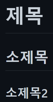 헤딩테그: # 제목, ## 소제목, ### 소제목2, ... -> 샾이 많을수록 크기가 작아짐