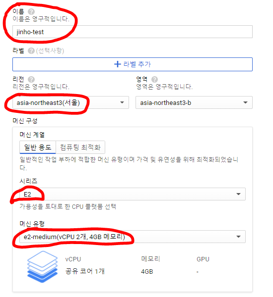인스턴스 이름, 지역, 시리즈, 머신 유형을 선택해준다.