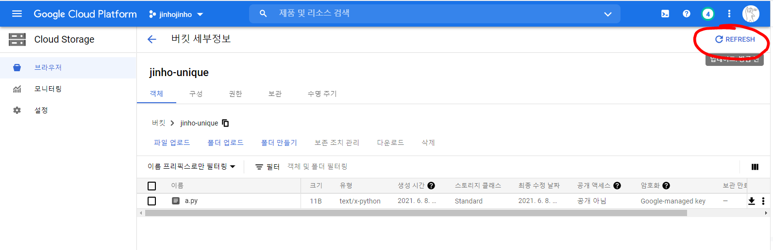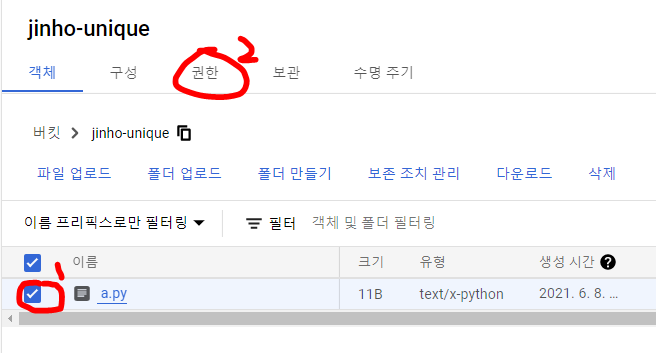gsutil cp a.py gs://jinho-unique -> jinho-unique 버킷에 방금 만든 a.py를 복사해주는 명령어다.