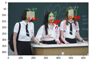 img[y:y+h, x:x+w] = mosaic_img # 인식된 얼굴 영역 모자이크 처리