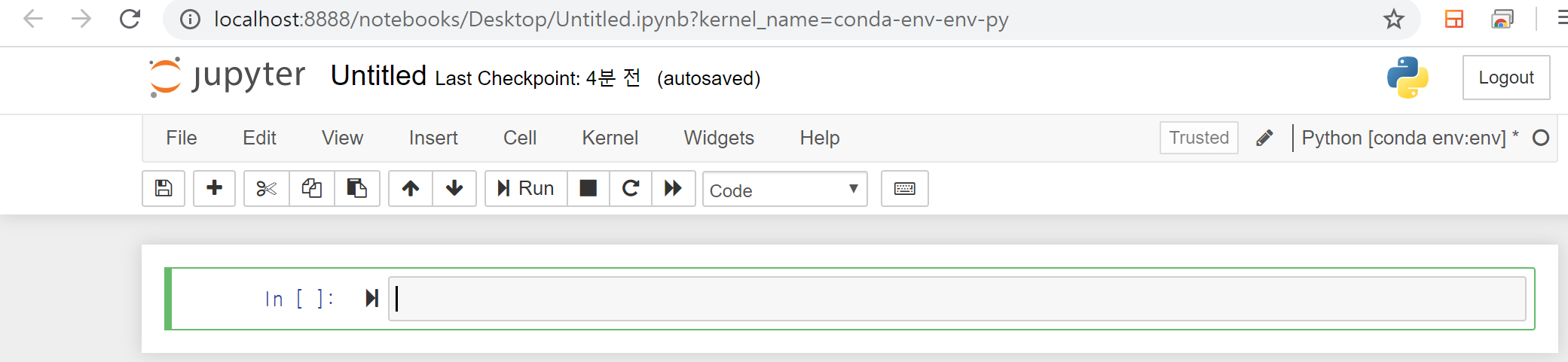 위와 같이 창이 뜰 거고 저기서 new -> python [conda env:<환경 이름>]을 누르면 아래와 같이 ipynb파일이 생성된다.